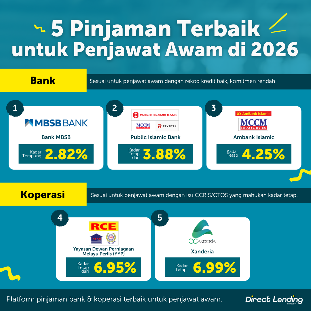 Jika anda penjawat awam dan mempunyai skor kredit yang baik, anda layak untuk memohon pinjaman peribadi dengan kadar faedah paling rendah daripada bank seperti MBSB Bank, Public Islamic Bank atau Ambank Islamic. Pinjaman bank biasanya menawarkan kadar keuntungan lebih rendah berbanding koperasi dan payout yang tinggi, sesuai untuk penjawat awam yang mahu bayaran bulanan lebih ringan. Dengan rekod kredit yang cantik, peluang lulus juga jauh lebih tinggi dan anda boleh pilih pakej pinjaman peribadi terbaik untuk kakitangan kerajaan dengan tempoh bayaran dan kadar faedah yang paling menguntungkan.